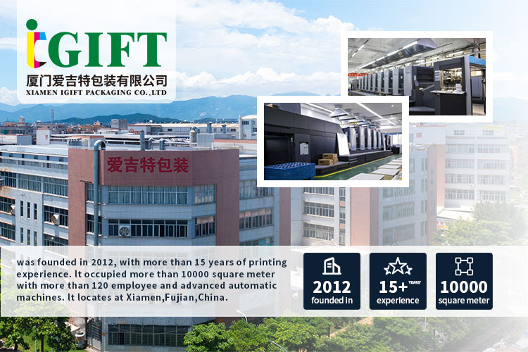 Established in 2012, Xiamen IGIFT packaging Co., Ltd had grown into one of the top manufacturers of packaging products. It covers an area of more than 10,000 square meter, which locates at Xiamen City, Fujian Province, China. There are more than 150 employee and many advanced HEIDELBERG 6C printing machines and many other automatic eqiupments. Meanwhile, the audit reports we have are FSC-C215866, SEDEX/SMETA, SA8000. Your visit to our factory is welcome.